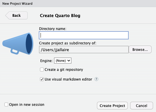 To create a new blog project within RStudio, use the New Project command and select Quarto Blog: